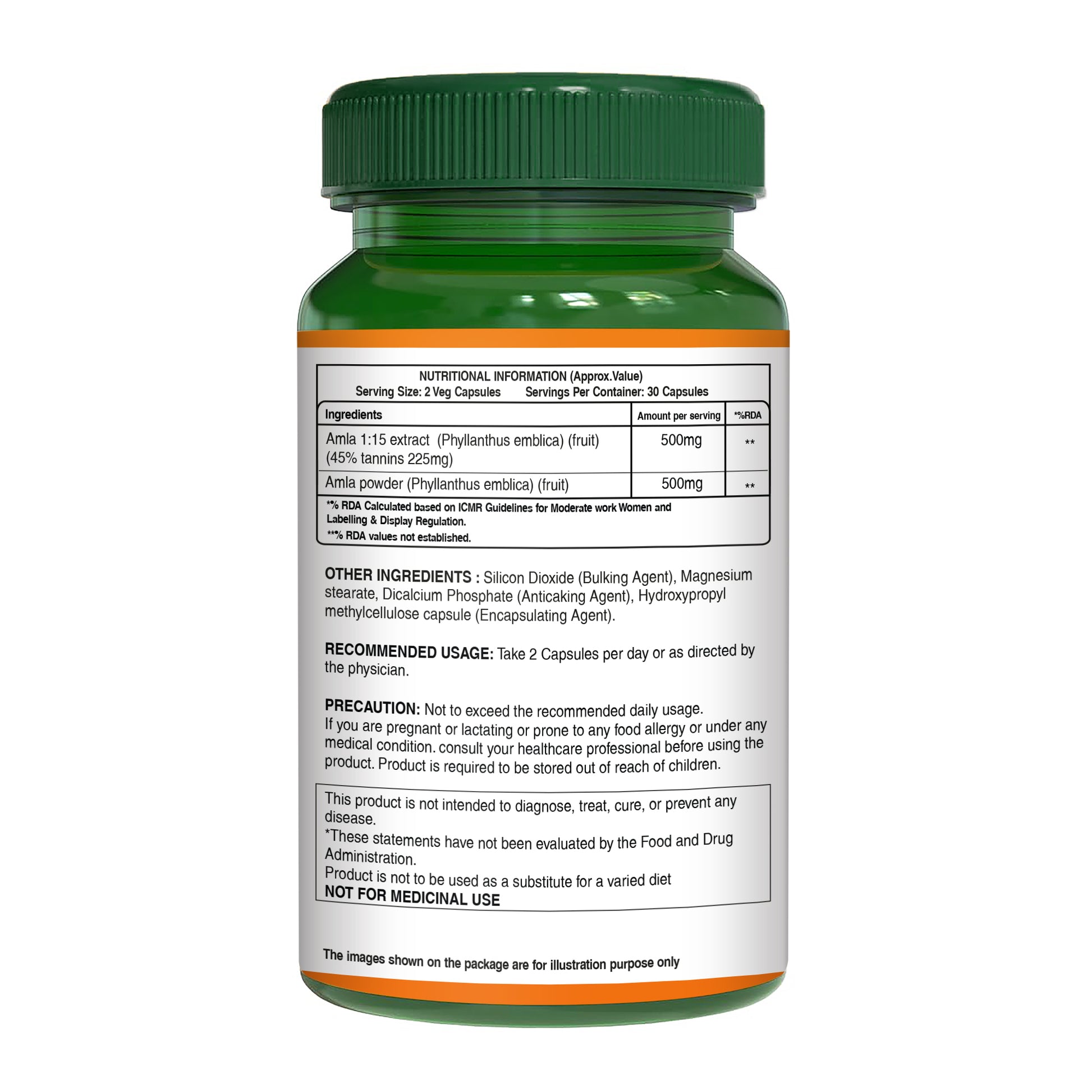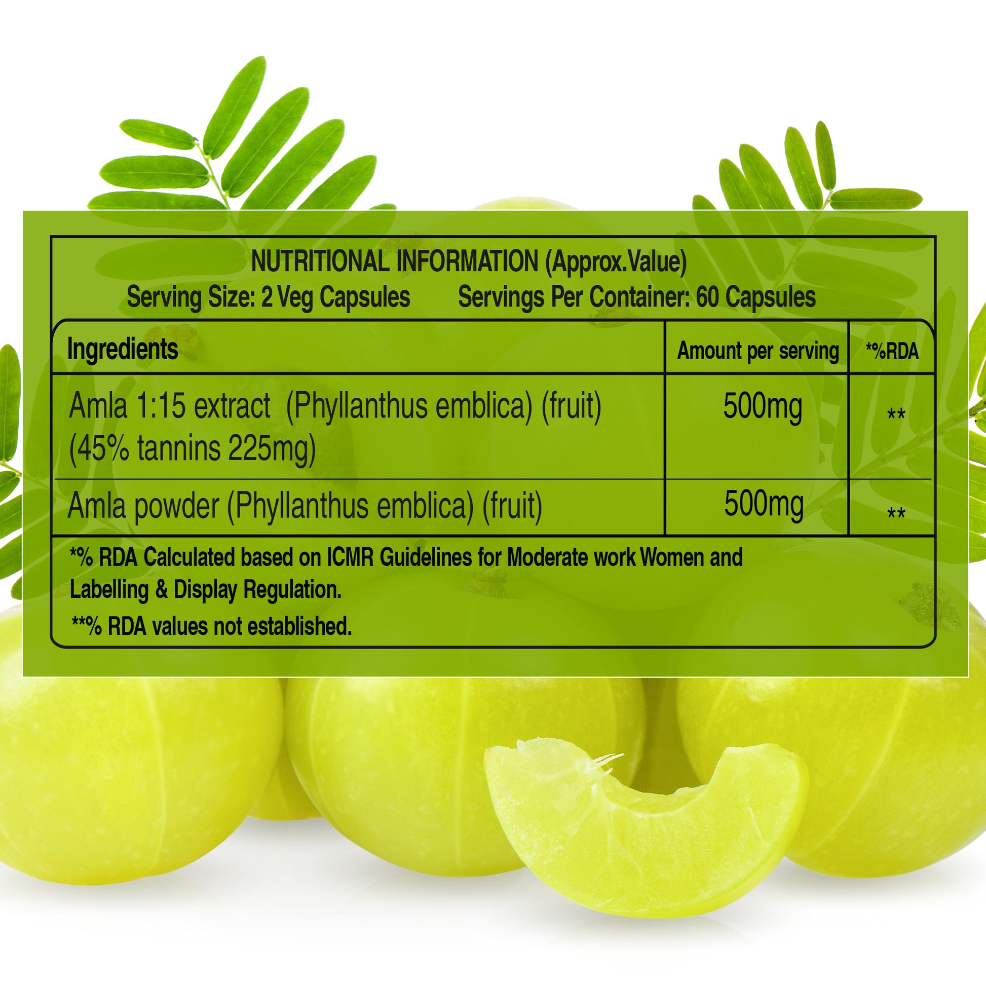 2). Rich Source of Vitamin C. Each Serving of 1000mg provides 500mg Amla Fruit Extract + 500mg Amla Fruit Powder. ( Equivalent to 8000mg Amla Powder )