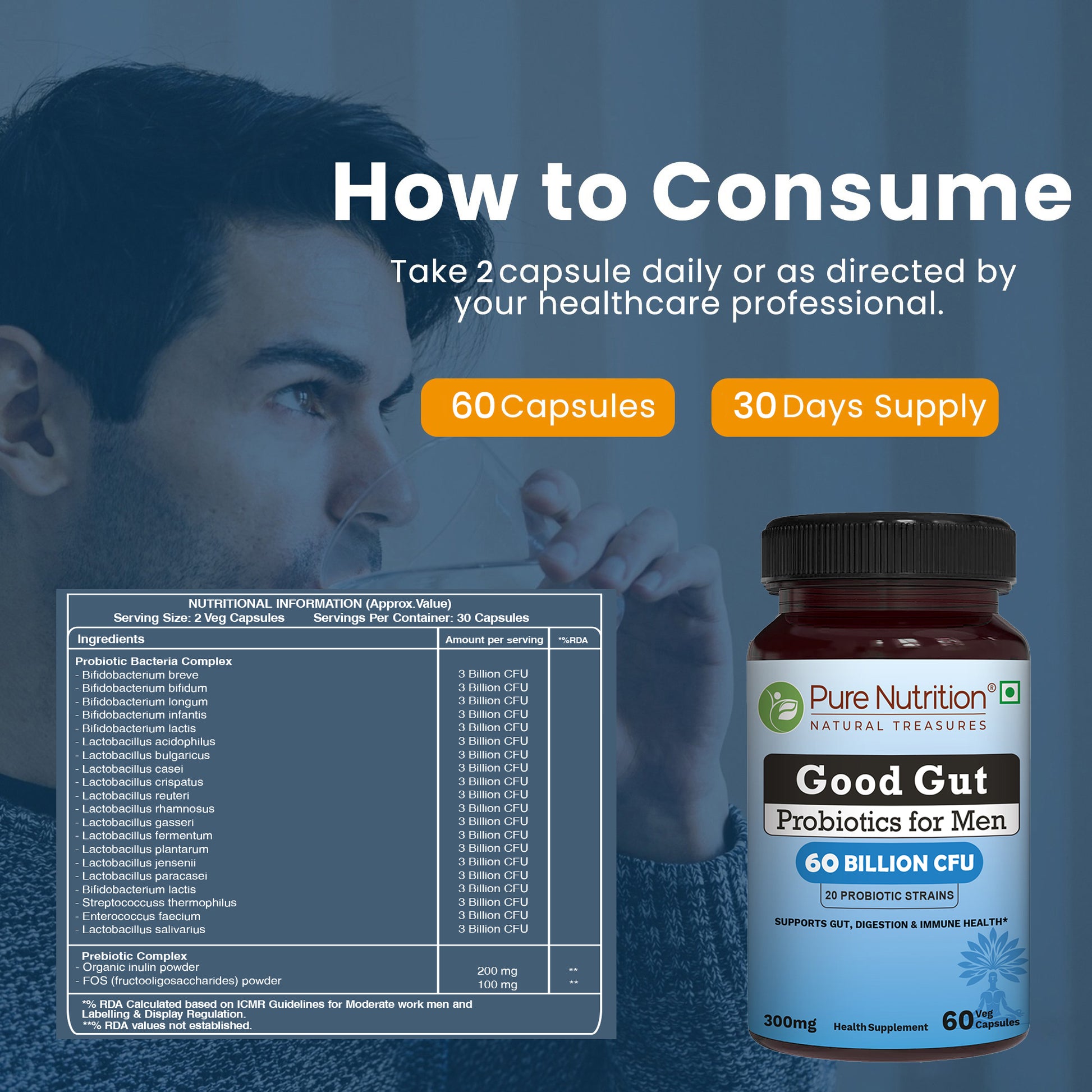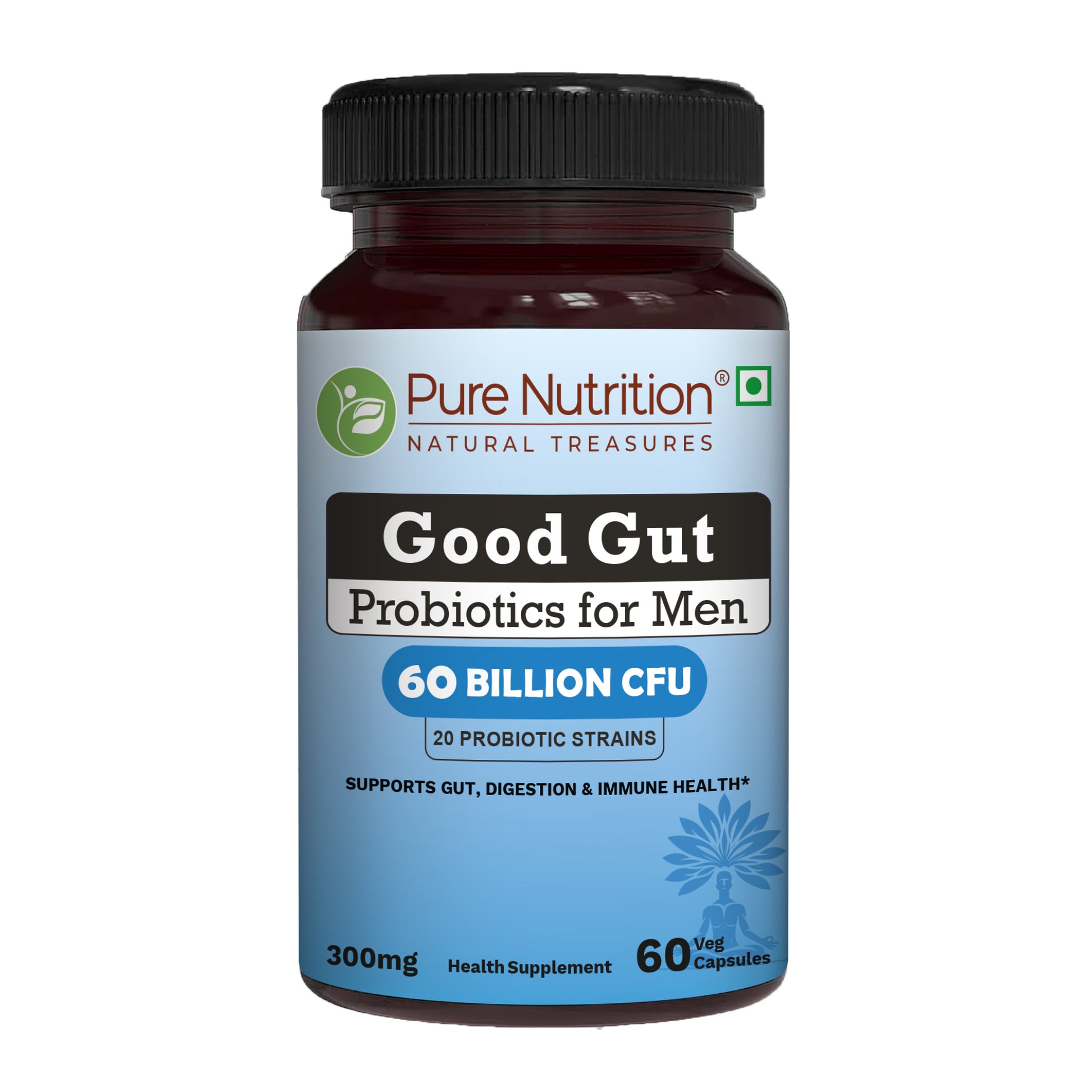 High Potency Formula: Each serving Of Pure Nutrition Men's Probiotic delivers 60 billion CFU of diverse probiotic strains, formulated specifically for men’s gut health requirements. Probiotic Diversity: This Probiotic for men contains a broad spectrum of 20 carefully selected probiotic strains, including Lactobacillus and Bifidobacterium, to support overall gut balance. Advanced Prebiotic Blend: Pure Nutrition Men's Probiotic features a combination of Jerusalem artichoke root, chicory root, and Acacia Senegal to nourish and maintain the probiotics in your system. Supports Gut-Brain Connection: Pure Nutrition Men's Probiotic for digestive health also supports the gut-brain axis, which in turn aids in feeling more focused, balanced, and resilient throughout the day. Clean label and suitable for daily use: Pure Nutrition supplements are free from GMOs, gluten, soy, and artificial colors. ONE CAPS DAILY | 60 DAYS SUPPLY