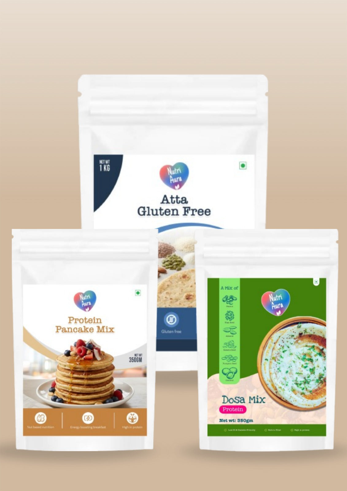 Fuel your day with NutriAura’s power-packed value combo: Gluten-Free Atta (1kg) for light and easy digestion, Protein Dosa Mix (350g) for a nourishing, protein-rich breakfast, and Protein Pancake Mix (350g) for a wholesome start to your mornings. A smart combination designed to support strength, balance, and a healthier lifestyle!